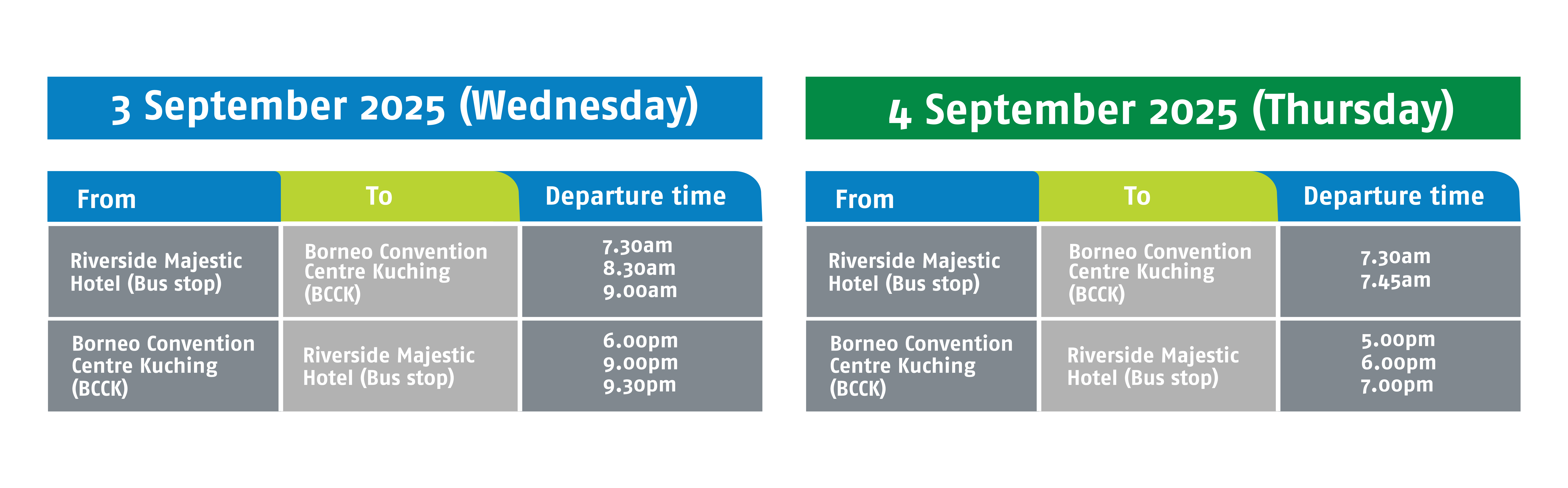 For greater convenience, complimentary transfer services will be provided for registered SAREF 4.0 delegates between Borneo Convention Centre Kuching (BCCK) and the designated pick-up point at Riverside Majestic Hotel bus stop.
